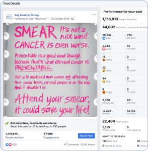 One of the Practice’s early posts, delivered with the support of Redmoor Health, was their Cervical Screening campaign, which reached over 1 million people. It prompted a dialogue online and secured new followers to the page, but most importantly it demonstrated to the Practice that their Call-to-Action worked. This alongside a variety of initiatives has helped support an increase in cervical screening in the practice. Continued awareness raising of smear testing over time supported by social media campaigns has helped increase the numbers of under 50’s patients receiving a smear test from 72% to 89%, making for better patient care and increasing practice income.