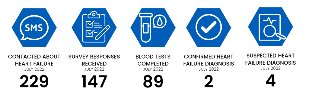 For the heart failure screening, 229 patients were contacted. The survey had a higher response rate of 147 (65%). Out of these responses, 89 (39%) patients had one or more positive symptoms and were invited for a blood test, six patients have been identified as having abnormal results. Clinicians have reviewed these patients and referred them to cardiologists. Two were confirmed to have heart failure diagnosis with the other four patients waiting for further investigation.