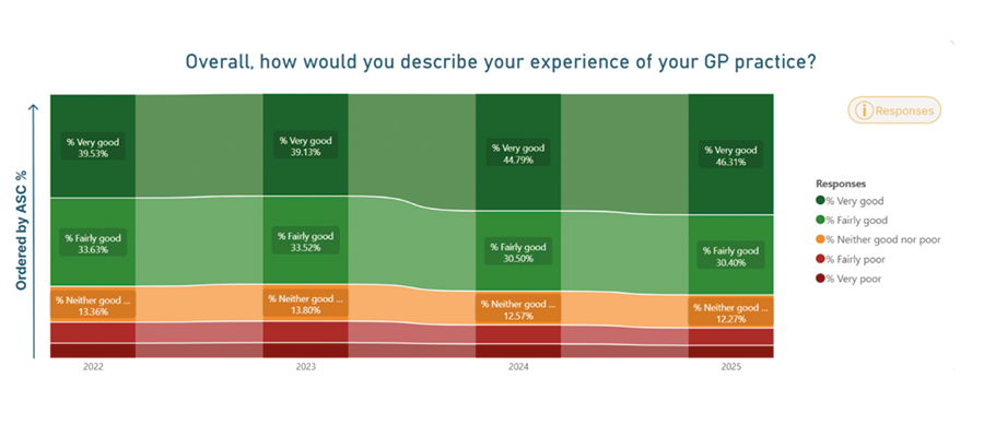 GP Survey results show modest improvement at the headline level. The proportion of patients reporting a “very good” overall experience of their GP practice increased again in 2025, continuing a gradual upward trend. This improvement sits alongside ongoing access pressure and high phone demand, suggesting that experience is being shaped by factors beyond speed of contact alone, including communication, expectation-setting and continuity.