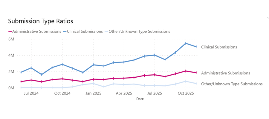 The mix of requests also shifted as the year went on. Clinical submissions grew faster than administrative ones, widening the gap between the two. This is broadly what would be expected. Practices that are less confident with online consultations tend to start by limiting use to administrative requests. As confidence grows, clinical submissions are turned on for an increasing number of appointment requests. The steady rise in clinical submissions through mid-2025 suggests many practices were already moving in that direction before the October deadline, with the autumn increase reinforcing online consultation as a routine clinical access route.