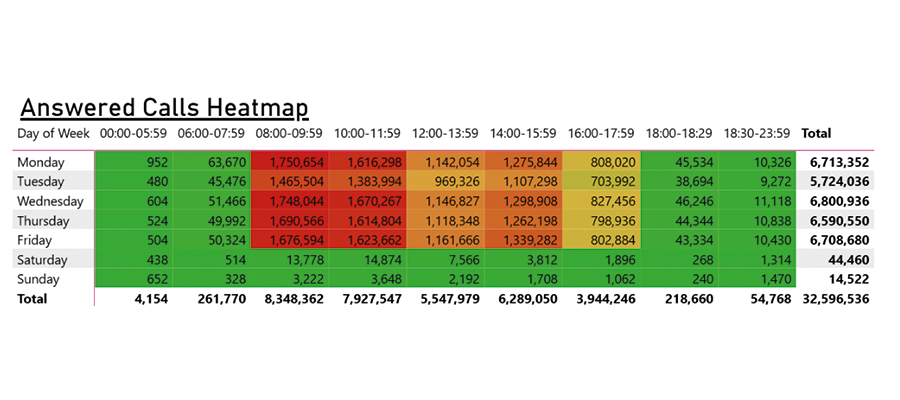 Timing data reinforces this. Call demand was heavily concentrated in weekday mornings, mirroring online consultation patterns. Most calls were relatively short, but the cumulative handling time was substantial. The pressure point was not call length, but call volume arriving in narrow time windows.